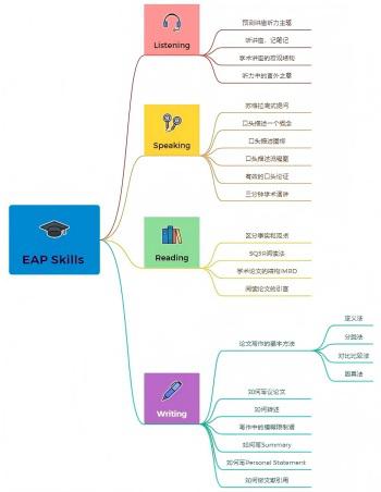 《通用学术英语(技能篇)》旨在提升学生的学术英语技能和学术英语素养,为大学生在国内外开展专业学习和发展提供语言支撑。本课程于2023年5月获批第二批国家级本科一流在线课程,并于2024年12月获评“全国在线开放课程/MOOC教学优秀案例”,在“高等教育出版社”正式出版基于此课程的“数字课程”1门。本MOOC教学环节包括授课-讨论-拓展-测评,通过精心的教学设计和精选的教学内容,帮助学生EAP技能的全面提升和EAP能力的发展。 “通用学术英语”的学习不需要学生具备专业的背景知识,课程中讲授的是学术英语中核心的听、说、读、写技能,如下图所示: