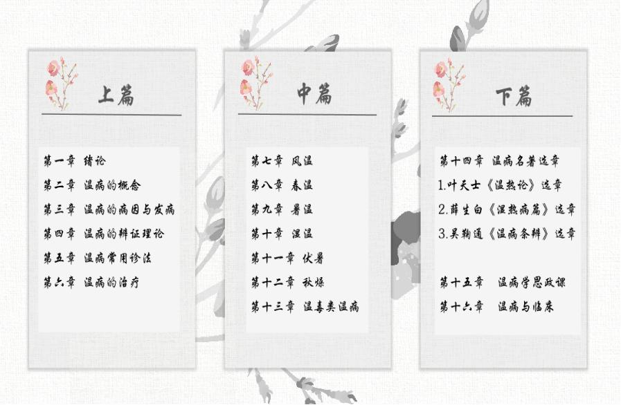 本门课程主要分为三个部分:1.温病学的基本理论知识和基本技能,主要介绍温病学和温病的概念、病因与发病、温病辨证、常用诊法、防治方法;2.常见温病证治,主要介绍各种温病的病因病机、诊断、辨证论治;3.温病学原著选读,选讲《温热论》、《湿热病篇》、《温病条辨》。
