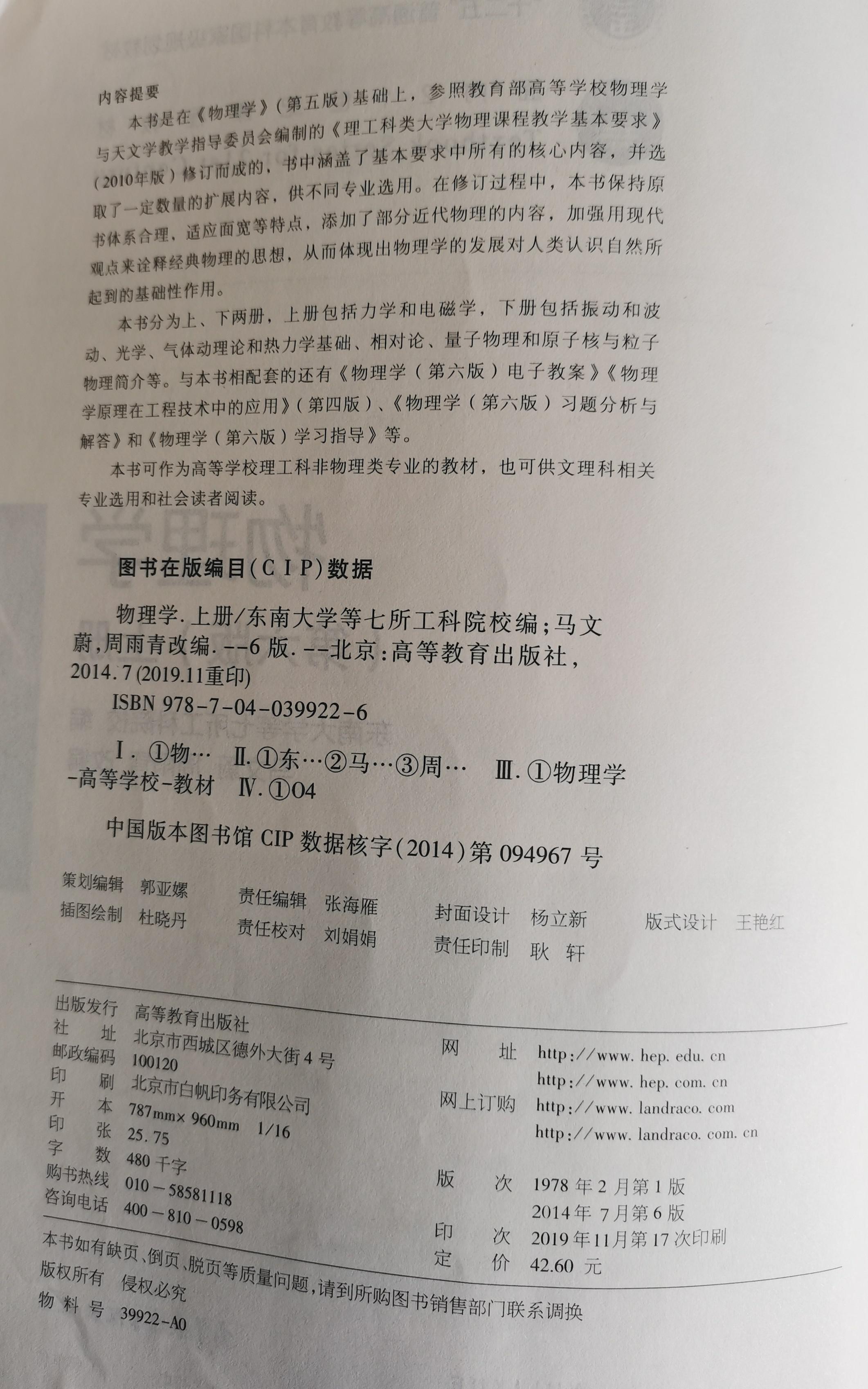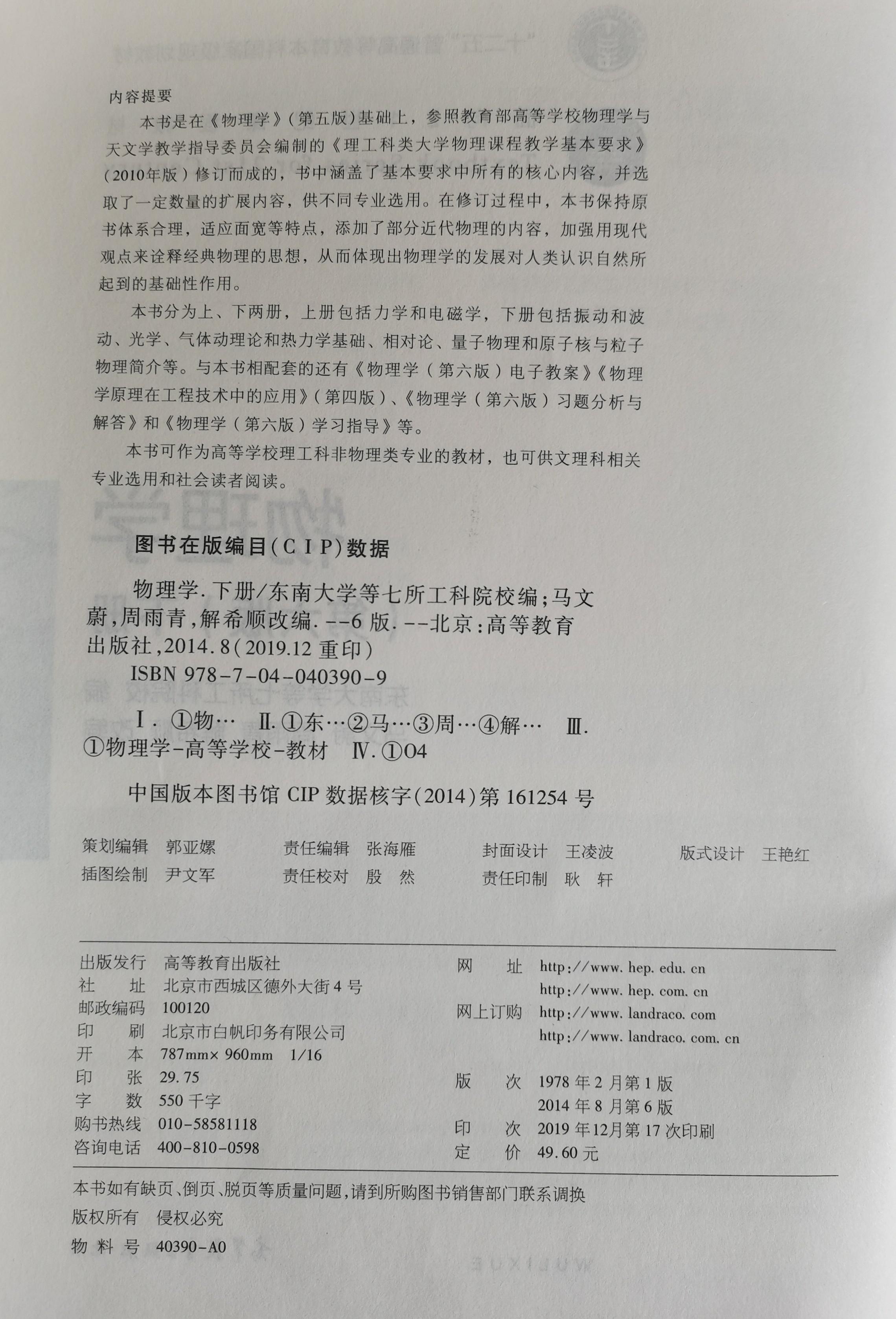 6、马文蔚. 物理学习题分析与解答【M】. 第五版. 北京:高等教育出版社,2006年.