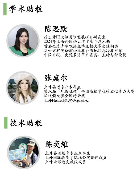 在《英语演讲》,你将得到来自专业团队的支持。三位主讲教师热爱教育,多次获校级、国家级教学奖项,具有丰富的演讲教学和竞赛指导经验。十余名在国、市、校级比赛获奖的同学将与你分享实战经验。数十名教育学、教育技术专业师生为你提供技术支持。