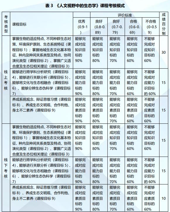 形成性考核中的作业及测试包括线上作业测验和线下课堂作业;课堂讨论互动包括个性化参与(现场演示、师生互动、生生辩论)、案例分析(自然案例、人文案例、融合案例)及学习心得(知识点心得、能力提升、价值观塑造)。总结性考核中,除了通过期末考试教师出题完成知识、能力及部分素质测试外,还专门设置了“三自”考核,即让学生自己命题、自己打分、自我评价。在自主命题上,将全班(300-500人)按每组20人左右分成若干小组。按照第一组给第二组、第二组给第三组的顺序依序评分;每组对小组出题的依据给出简短理由,每组对评分的标准给出理由、对答题内容给出简短评价。在知识目标上,将考核中的构建劣构知识点与良构知识点相结合,促进学生的知识内化;在能力目标上,兼顾关联分析、跨学科分析及伪科学分辨能力;在素质目标上,兼顾生态文明观、系统生态观及利他共生。