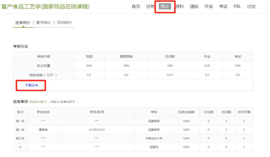 (2)PC端领取:如果注册本慕课时未绑定邮箱,一般都不会提醒,但可以在PC机登录本慕课后在“统计”栏目下载证书: