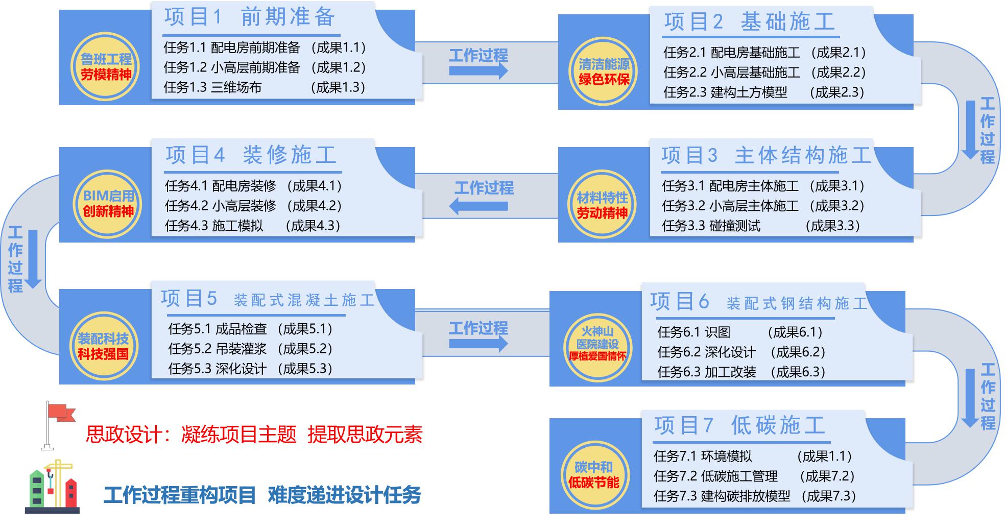 设计“凝炼项目主题-提取思政元素”的思政融入路径:通过项目凝炼“鲁班工程﹑清洁能源......”等主题,提取“劳模精神﹑绿色环保.....”等思政元素,思政案例30个。