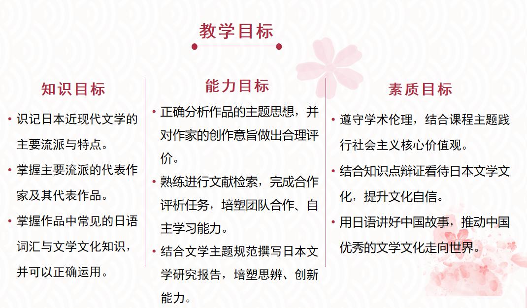 秋本课程是日语专业高年级阶段的主干课程,内容涵盖日本近现代12个主要流派的15位代表作家及其代表作品。本课程坚持以立德树人为根本任务,基于OBE教学理念,利用O-AMAS教学模型,根据目标反向设计教学内容。以学生为中心,基于问题导向和产出导向的双重导向,通过空间维度、目标维度、评价主体维度的“三维度评价”体系,推行“学、研、赛、创”四阶融合的实践组织实施方式。通过“课前、课中、课后、课余”四个环节实现低起点、多层次、循序渐进地完成从低阶到高阶目标的学习和应用,培养学生的自主、合作、探究式学习能力,提高学生的综合素质。课前线上环节完成对预留思政内容的自我感悟,课中线下环节实现思政内容的升华,课余实践环节完成思政内容的内化和践行和,实现了思政教育的全过程引领。教师团队制作系列专题视频,并将最新的学术观点和学术成果融入其中,让学生获得最新的科研动态;同时搜集日语原声电影、学术前沿资料等线上资源作为课余拓展资源,拓宽学生的知识面。